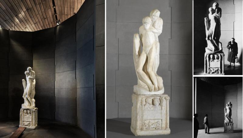 Perché questa sua nuova collocazione, oltre a mancare totalmente di fascino ha anche privato l'opera del mistero del 'rinvenimento' che invece la connotava nel 'vecchio' sito, progettato dai BBPR. Là sì che si era invitati a scoprirla, sorpresa tra le sorprese, soltanto al termine del percorso museale e a disvelarla, giunti alla Sala degli Scarlioni, contenuta come era, a mo' di perla rara, entro la valva di quell'ostrica formata dal diaframma semicircolare della quinta che la circondava su tre lati, magistralmente concepita dai tetrarchi milanesi dell'architettura. Allora sì che al solo vederla dava il batticuore. Girandole attorno, piano, piano, poi, se ne scoprivano i dettagli. Si ammiravano le rudi, sublimi incompiutezze del 'non finito' michelangiolesco. Si contemplavano i segni delle sue energiche martellate che quasi ce ne facevano percepire la fatica e il sudore della fronte mentre le assestava in preda al noto furor.