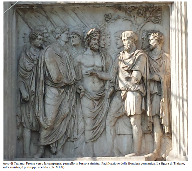 La prima figura che apparve fu quella di un uomo togato sulla sinistra della scena che aveva i tratti dell’imperatore Traiano. Il giovane passò poi a liberare dal marmo superfluo la parte centrale, da cui fece emergere l’immagine di Giove Feretrio. Maestoso e severo, col corpo aitante come quello di un atleta, il Padre degli uomini e degli dei impugnava fulmini e saette e guardava verso destra, dove di lì a poco comparve un soggetto barbuto con indosso una corta tunica, stretta alla cintola e alti calzari che gli lasciavano scoperti i poderosi ginocchi. Imponente ed umile al contempo, il capo dei nemici sconfitti, era colto nell’atto di sottomettersi all’imperatore dei Romani.