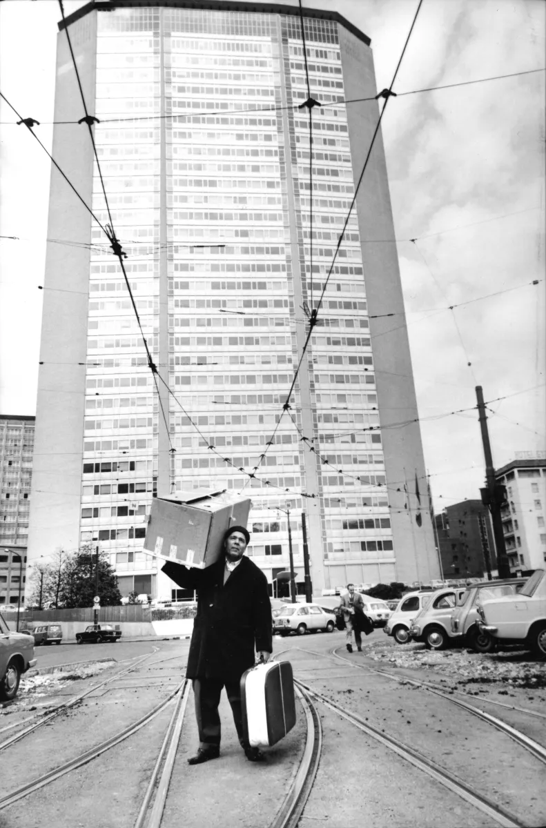 Lo spiega la didascalia che recita: Immigrato sardo davanti al grattacielo Pirelli, Milano 1968. Arriva da lontano, di là dal mare. Quali e quanti transiti ci saranno stati lungo questo viaggio, tutti compiuti con quel pacco sulle spalle? Questo la didascalia non lo dice, e se non ci fosse questo titolo non sapremmo neppure che è sardo e che proviene da un’isola. La seconda cosa che colpisce è il grattacielo dietro di lui. Il simbolo stesso di Milano, almeno per diversi decenni: la sede della Pirelli, ovvero una delle aziende della modernità italiana. Il grattacielo di Giò Ponti e Pier Luigi Nervi è altissimo, tanto che non ci sta tutto nella fotografia: appare immenso. Schiaccia l’uomo lì sotto.