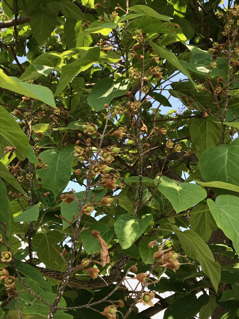 Albero deciduo dal portamento maestoso, può raggiungere i venti metri d’altezza ed espandere un’ampia chioma globosa. I rami assurgenti si innestano nella parte medio-alta del fusto dritto che, nei giovani esemplari, mostra una tenera scorza grigioverde picchiettata da lenticelle, fessurata e bruna nei più vecchi. Sono fiori e foglie a renderla una pianta da prendere in considerazione per ampi giardini privati e pubblici. I primi, ermafroditi, compaiono su lunghe e rigide pannocchie terminali: le corolle tubolari, violette sfumate di bianco, aprono una fauce venata di pallido giallo, dall’orlo inciso in cinque lobi – più pronunciati gli inferiori – ripiegati all’indietro, da cui emana un profumo dolce, avvolgente. Le foglie, ancora piccole, occhieggiano timide per non rubare la scena, consapevoli che la parata sarà effimera. Presto, quando i tromboncini lasceranno il posto alle capsule ovate dei frutti, potranno distendere la grande lamina cuoriforme e dondolarsi dai lunghi piccioli.