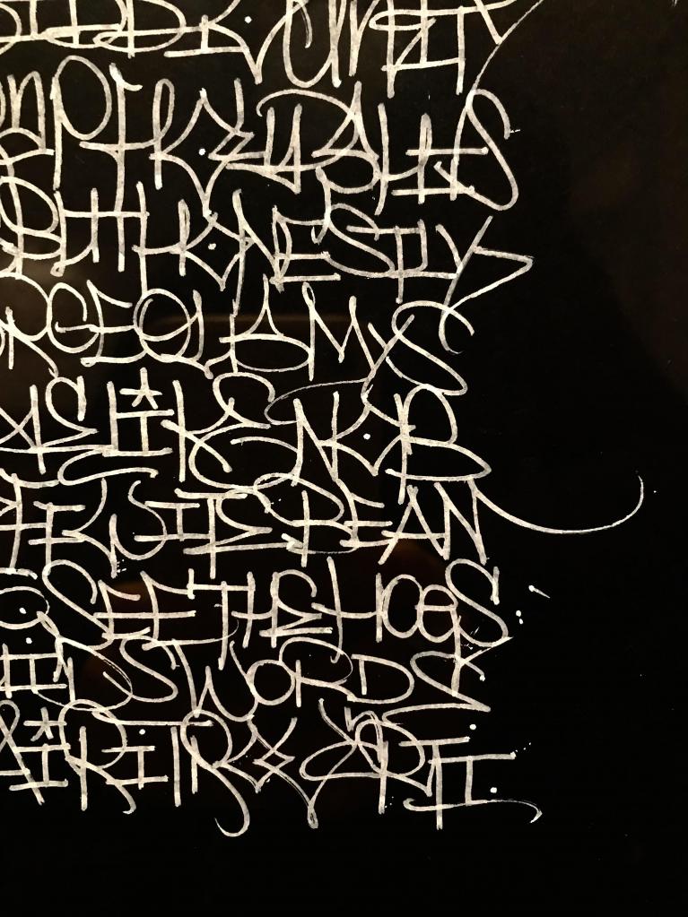 Si perde, innanzitutto, la strada diritta della scrittura ben arata, per riprendere il filo della similitudine da cui siamo partiti, per trovarsi faccia a faccia con oggetti visivi in cui c’è molto poco da leggere e molto di più da vedere: pagine fittissime di lettere che sfiorano la scrittura asemica, come in Trama meditativa, in cui sembra di veder affiorare a fatica qualche parola ma si è più che altro sommersi dalla furia ordinata di una scrittura elaborata e serrata; oppure vere e proprie tele in cui campeggiano enormi oggetti calligrafici, in inchiostro nero e oro, dal sapore gotico ma vistosi come le tag della street art.