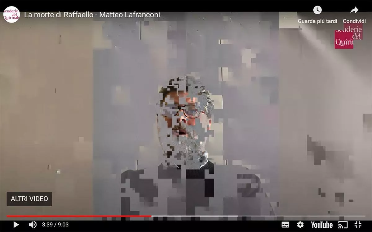 In questi video però si vede e si ascolta anche altro, in maniera inattesa. I grafici potranno ammirare le incursioni visive, generate da errori di codifica digitale, in alcuni passaggi del video La morte di Raffaello di Matteo Lanfranconi, così come gli estimatori del “noise” potranno apprezzare a 4’ e 30’’ del video Raffaello e Giulio Romano l’ascolto di alcune sonorità. Se è vero quello che sostiene Régis Debray, la nostra è una cultura che fa dello sguardo una modalità dell’ascolto: le immagini non stanno più davanti a noi ma ci sommergono, siamo immersi in un flusso visivo che crea un’atmosfera, un paesaggio, quasi sonoro.