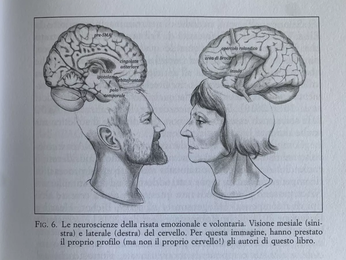 L’ipotesi proposta da Caruana e Palagi è basata sul modello dei due sistemi specchio che danno vita alla risonanza motoria e alla risonanza emozionale generando il riso: l’osservazione di un volto sorridente attiva nell’osservatore sia una risonanza motoria (via bassa) che una risonanza emozionale (via alta). In sintesi questo è il fondamento delle neuroscienze della risata emozionale e volontaria, come è chiaramente mostrato da una delle belle immagini disegnate che popolano il libro, avvalendosi del prestito del profilo degli autori. Quanto alla dichiarazione tra parentesi di non aver prestato il proprio cervello, si potrebbe facilmente obiettare che senza quel prestito non ci sarebbe il libro!