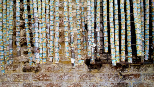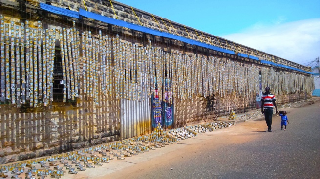 In an article with Nana Osei Kwadwo, Asante says of the curtains and tin cars,“they are planned through digital simulation models. My process is approached through mechanical engineering strategies. I appropriate the idea of bamboo curtains which can be found in local chop-bars across the country and the idea of tin cars which evokes the bricolage children’s toys that are popular in Ghana.” Here, within this process, a complex dialogue between reality and fabrication exists. There is a blurring of the boundaries as a toy tin car which is made alive through the imagination, is constructed out of a material used to hold a vital form of nutrition. Additionally, this material forms part of as Asante says, “the daily breakfast ritual.. a repetitive and serial process in our society.”