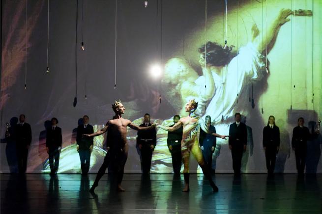 Laddove il referente è più noto e vicino nel tempo, si può gustare appieno la complessità dell’azione reinterpretativa di Fabre, e si può guardare attraverso la sua lente deformante: è il caso di Caffè Müller della Bausch. Ecco che la celebre camminata cieca della coreografa diventa un’inquietante marcia stimolata da un pungolo sulla schiena; i plies di Domenique Mercy vengono evocati da una delicata combinazione di passi classici, accennata nel centro del palco; la partitura bauschana di abbracci e cadute si trasforma in una lunghissima sequenza – tra le più belle dell’intero spettacolo – di voluttuose strette, di sospiri che dilatano il petto, di languidi addii. Un omaggio alla coreografa tedesca e al suo amore per le reiterazioni: un insegnamento che Fabre sembra aver appreso molto bene.