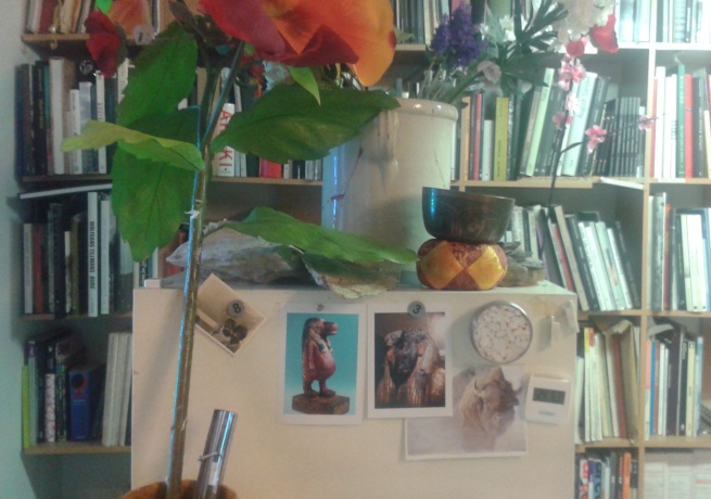 In un’altra zona dello studio mi fa allora vedere altre due immagini egizie. Una è un’ippopotama gravida, famosa mi pare, e mi dice: “Ha a che fare con il Nilo, ha a che fare con un’amplificazione dell’esistenza… È estremamente materna, ma non mediterranea; è una maternità cosmica, cioè la pancia della mamma, di ogni mamma…”. L’altra è un volto di una scultura lignea bruciata per metà, e mi dice: “Questa è svelatrice. Vedi? Nell’arte bruciata si vede l’albero di partenza, poi si vede la scultura, cioè quello che è diventato. Quindi c’è questo trapasso del trapasso…”. Accanto alle due immagini ne ha messo una di lui bambino con sua madre e dei vistosi fiori di plastica, “pop” dice. “Cioè”, dice, “il rapporto con l’immagine a questo punto non è nel rappresentato ma è… Ecco, è come la bustina del tè: la immergi nell’acqua e si spande. È un bagno ottico. Non è la dimostrazione, è un soffio caldo, è un massaggio, un massaggio senza contatto”.