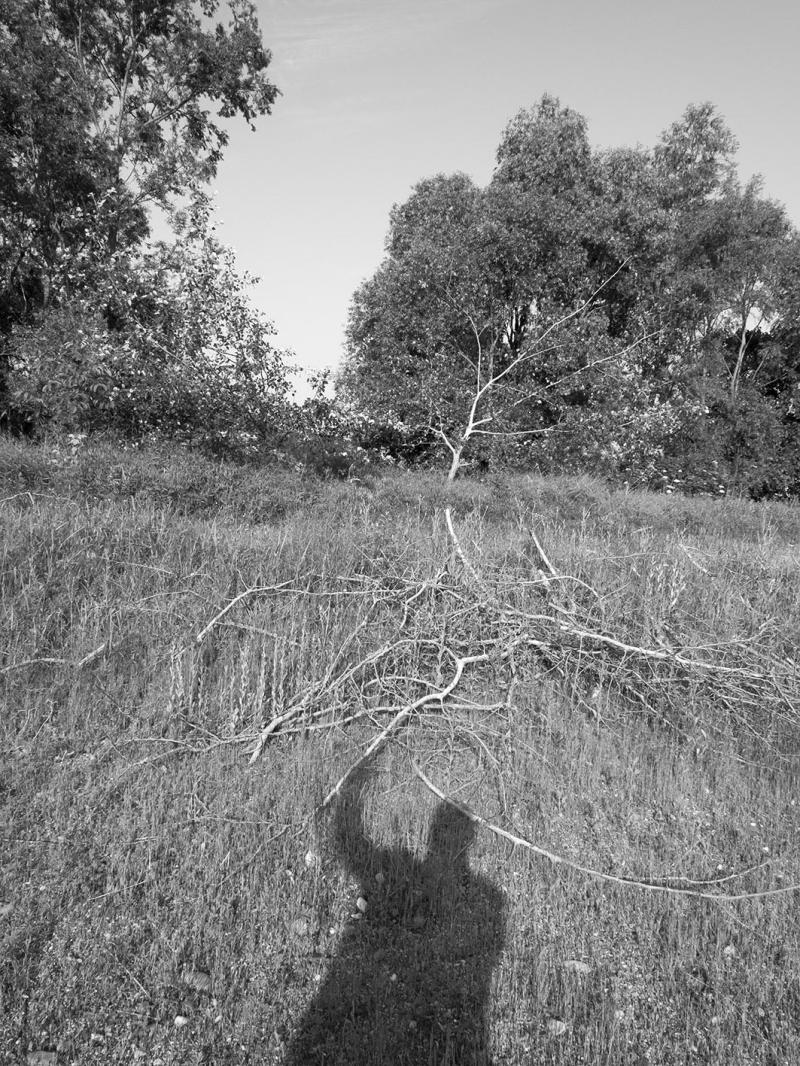 La poetica immersiva di Fossati cancella il dualismo e fonde, ribadisco in modo sovversivo, il soggetto Cultura dentro il ventre che lo ha generato. Sembra voler affermare che esiste solo una Natura, un tutto che è fatto da tutto e che non ammette gerarchie. L’idea va contro il pregiudizio antropocentrico e specista, vale a dire di tutta l’esperienza non solo giudaico cristiana, ma anche della filosofia occidentale dai precursori ai nostri giorni. Il viandante sul mare di nebbia di Caspar David Friedrich che, dall’alto di una rupe, guarda sotto di sé le svettanti montagne e le acque turbolenti, è agli antipodi di Vittore Fossati che vi si è fuso. Se si osservano attentamente le foto, si può notare che l’ombra delle gambe sfuma senza soluzione di continuità nella pozza d’acqua, che il braccio alzato della sagoma disegnata sul suolo sembra impugnare un ramo secco che somiglia a una falce, che un filo d’erba funge da seconda stanghetta per la montatura degli occhiali. In queste foto la didascalia non può essere: io c’ero, più realisticamente dev’essere noi siamo.