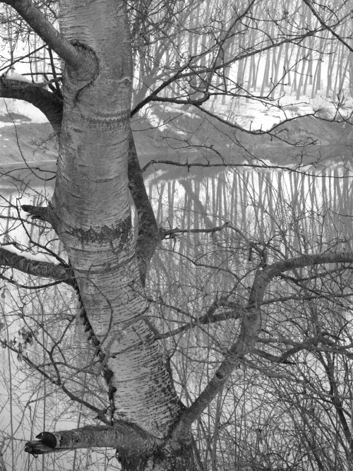 Per questo l’apparente impenetrabilità di quei luoghi, come un’epifania resistente a qualsiasi percezione frettolosa, esige, nel senso più autentico della parola, attenzione. Ed è in questa dimensione che qualcosa accade. Un lungo ramo sottile attraversa quasi tutto il fotogramma e tocca la punta di un albero; un altro ramo, per un effetto ottico, attraversa il fiume e va a sfiorare un albero sulla sponda opposta; le punte di due rami appaiono ai lati del fotogramma, come uncini che agganciano il fiume in primo piano a ciò che resta fuori dall’immagine. Fossati dà voce alla natura, e significato ai segni di cui si compone il paesaggio, che in assenza del suo intervento resterebbero confinati nel silenzio. Ciò che è lontano convive con ciò che è vicino, ed i singoli elementi si rafforzano a vicenda, permettendo a chi osserva di spingersi oltre il primo apparire della realtà.